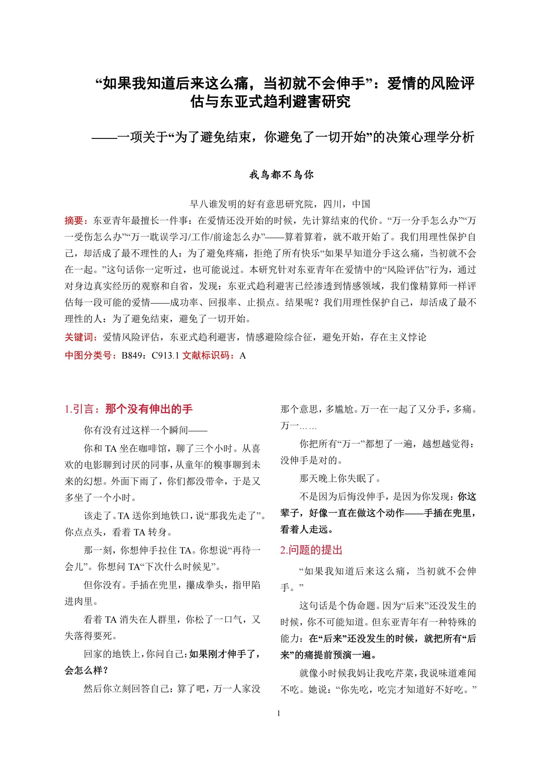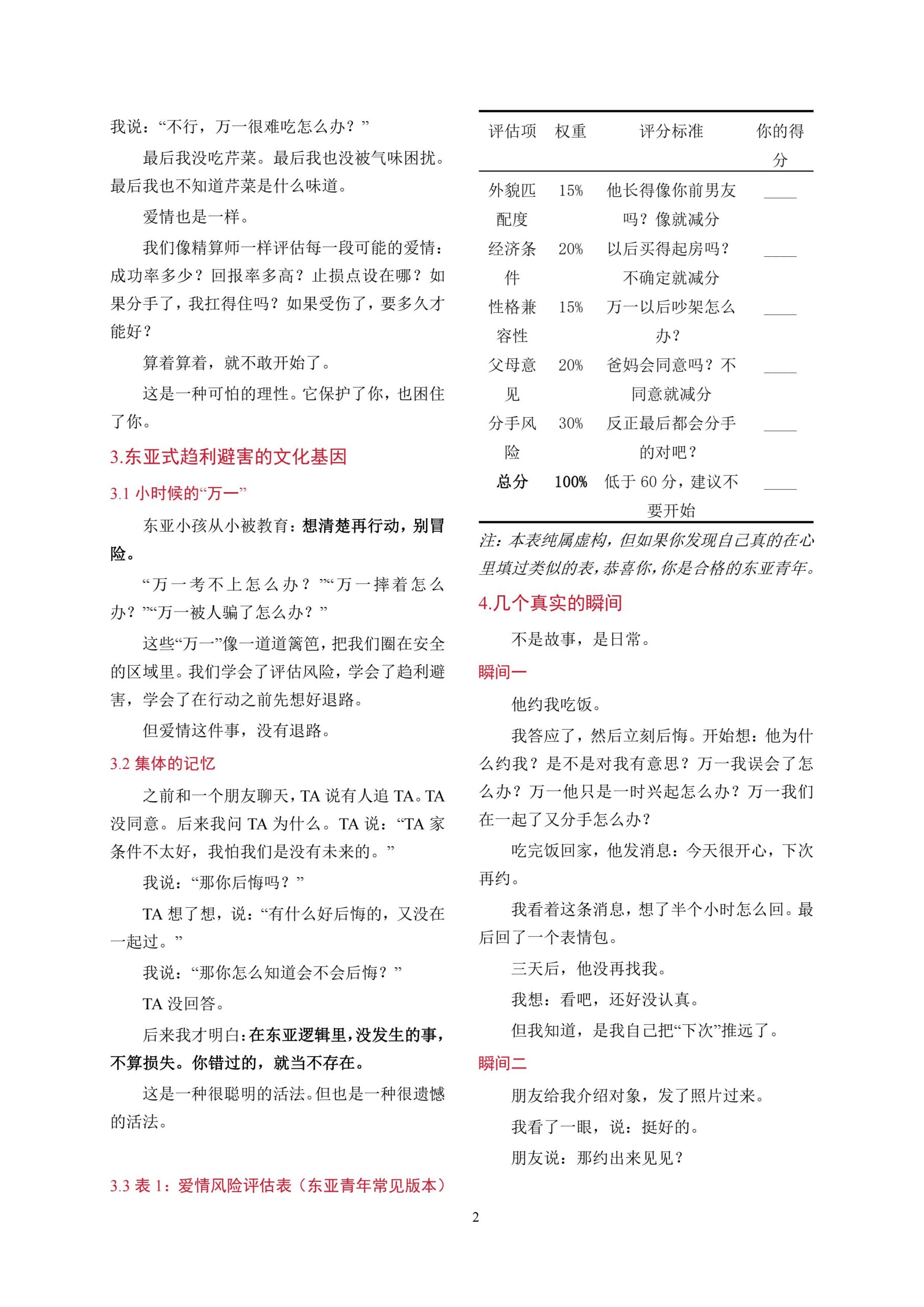 “如果我知道后来这么痛,当初就不会伸手”:爱情的风险评估与东亚式趋利避害研究