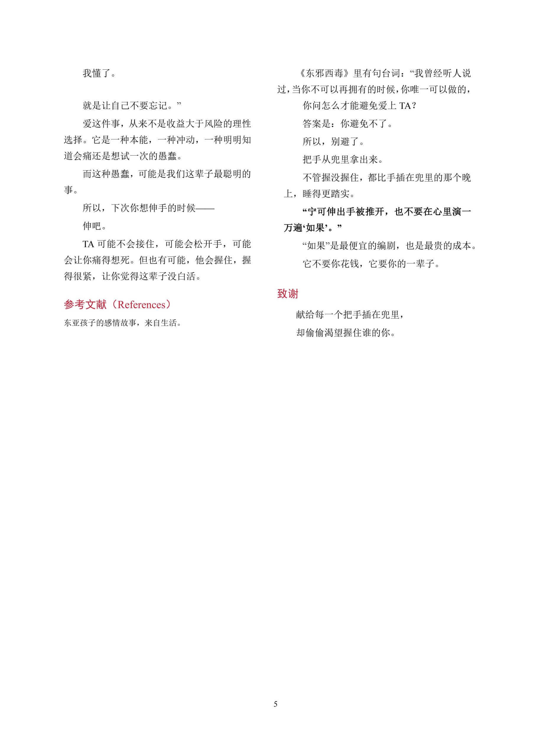 东亚青年最擅长一件事:在爱情还没开始的时候,先计算结束的代价。“万一分手怎么办”“万一受伤怎么办”“万一耽误学习/工作/前途怎么办”——算着算着,就不敢开始了。我们用理性保护自己,却活成了最不理性的人:为了避免疼痛,拒绝了所有快乐“如果早知道分手这么痛,当初就不会在一起。”这句话你一定听过,也可能说过。本研究针对东亚青年在爱情中的“风险评估”行为,通过对身边真实经历的观察和自省,发现:东亚式趋利避害已经渗透到情感领域,我们像精算师一样评估每一段可能的爱情——成功率、回报率、止损点。结果呢?我们用理性保护自己,却活成了最不理性的人:为了避免结束,避免了一切开始。